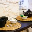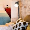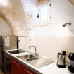Il letto matrimoniale, nascosto sotto un arco di pietra come un segreto svelato, invita a sognare tra le sue mura, impreziosito da una luminaria che sembra custodire storie di tradizioni antiche. Poco lontano, un divano accogliente invita a lasciarsi cullare dai pensieri, mentre ogni dettaglio, dal Wi-Fi alla cucina, dalla macchina del caffè all’armadio, accoglie con discrezione e cura.